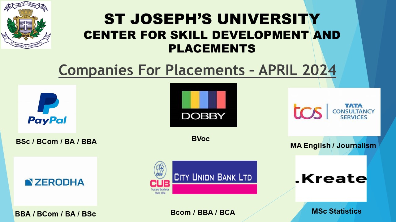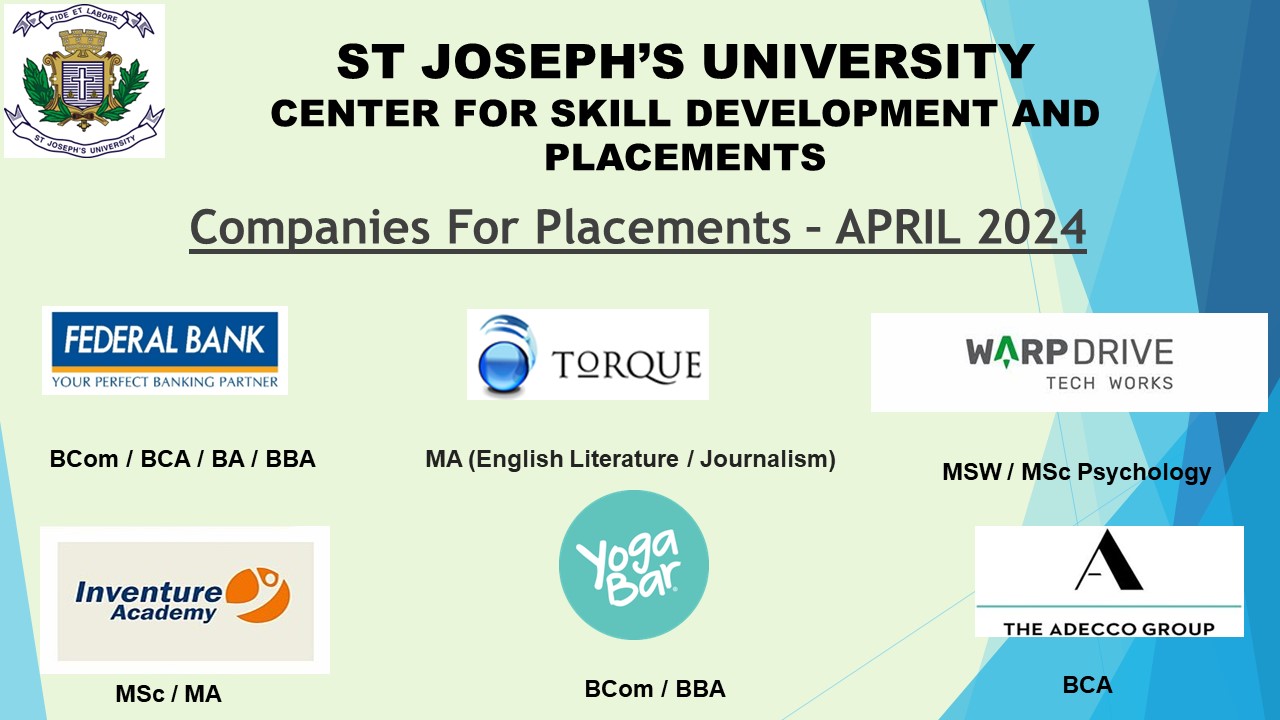 The Swiggy HR team with the 3 selected candidates on completion of the campus recruitment drive View Document → Mr Gautham Premkumar from Turing conducting a pre placement talk for the final year UG students at SJU Campus View Document → Ms Janhavi Deshpande, DGM, Talent Acquisition at Randstad conducting a pre placement talk for our final year students at SJU Campus View Document → Pre placement talk_ SBI Foundation_YouthForIndia Fellowship View Document → Companies for Placement View Document → Companies for Placement View Document → Congratulatory Posts for Placements View Document → Companies for Placement View Document → 2 Feburary 2024:Place Drive For Master of Science (MSc) in Big Data Analytics & Bachelor of Computer Applications (Data Analytics) conducted by ENATE Solutions View Document → 7 Feburary 2024:Upcoming Companies View Document →