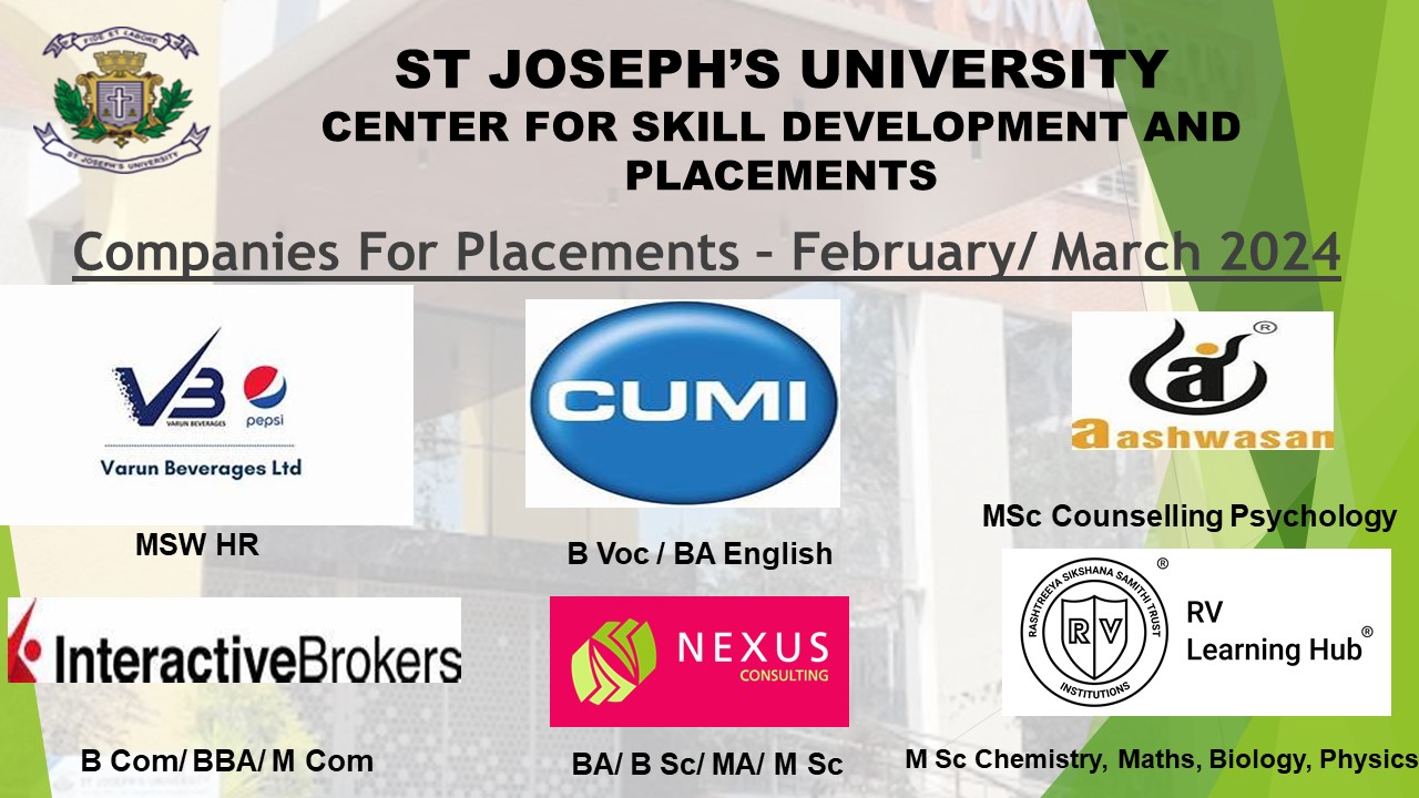 The Swiggy HR team with the 3 selected candidates on completion of the campus recruitment drive View Document → Mr Gautham Premkumar from Turing conducting a pre placement talk for the final year UG students at SJU Campus View Document → Ms Janhavi Deshpande, DGM, Talent Acquisition at Randstad conducting a pre placement talk for our final year students at SJU Campus View Document → Pre placement talk_ SBI Foundation_YouthForIndia Fellowship View Document → Companies for Placement View Document → Companies for Placement View Document → Congratulatory Posts for Placements View Document → Companies for Placement View Document → 2 Feburary 2024:Place Drive For Master of Science (MSc) in Big Data Analytics & Bachelor of Computer Applications (Data Analytics) conducted by ENATE Solutions View Document → 7 Feburary 2024:Upcoming Companies View Document →